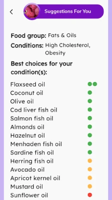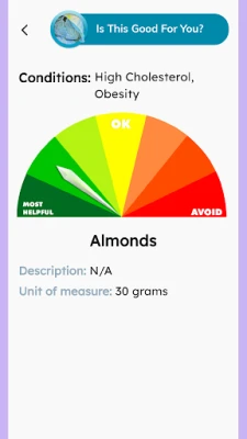 • Is this food good for me? This feature answers the common question if a food of your choice helpful or harmful to your personal situation. And it does so in an easy to understand and colorful graphic form.
